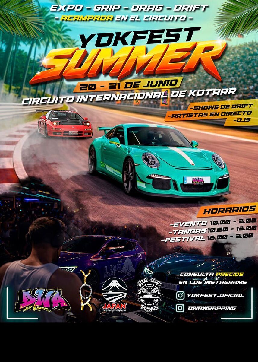 En YOKFEST podrás disfrutar de DRIFT con pilotos profesionales del sector, una expo totalmente distinta a lo habitual y llena de sorpresas, emocionantes carreras de DRAG y competiciones de GRIP que pondrán a prueba cada KM al máximo, todo acompañado de buena música en directo.